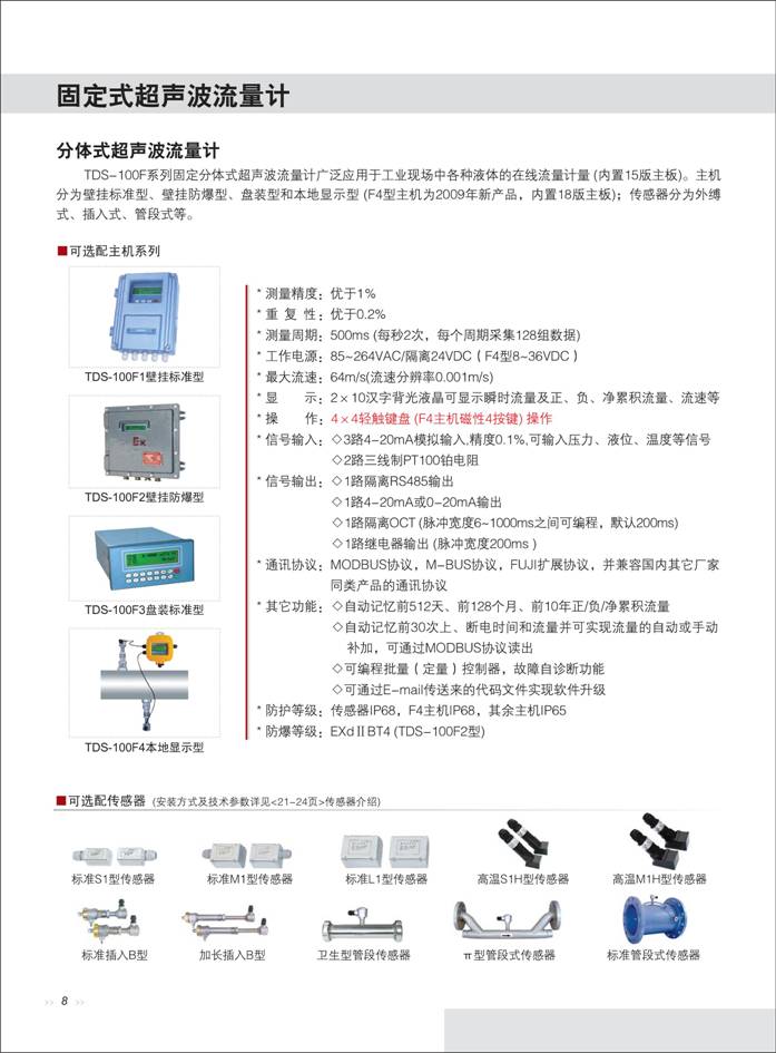 超聲波流量計 一、概 述 AK-TDS-100F型固定式超聲波流量計利用了低電壓、多脈沖時差原理,采用高精度和超穩定的雙平衡信號差分發射、差分接收數字檢測技術來測量順流和逆流方向的聲波傳輸時