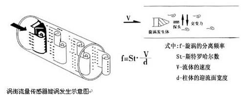 一定雷諾數(shù)范圍內(nèi)(2×104~7×106 ),旋渦的釋放頻率f與流體流速V及旋渦發(fā)生體的迎流面寬度d之間關(guān)系式為f=St?v/d,式中St 為斯特勞哈數(shù),它是一個無量綱的系數(shù),只要準(zhǔn)確測出頻率f,就可以求得流體流速v,由v求出體積流量。
