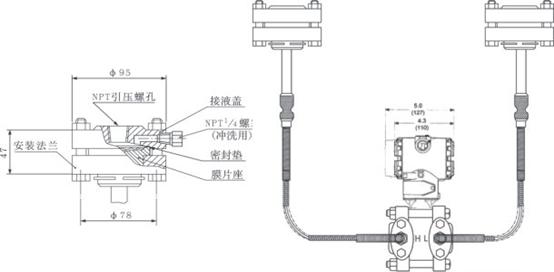 AK-3051DP雙法蘭液位變送器是一種通過安裝在管道或容器上的遠傳裝置來感受被測壓力,該壓力經毛細管內的灌充硅油(或其它的液體)傳遞至變送器的主體,然后由變送器主體內的δ室和放大線路板,將壓力或差壓轉換4~20mA.DC信號輸出(參見結構原理圖)。  |
