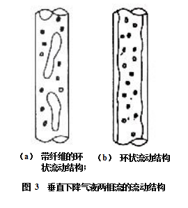 在垂直下降管道中,氣液兩相流動(dòng)的結(jié)構(gòu)與作垂直上升流動(dòng)時(shí)的結(jié)構(gòu)很相似,但有不同,不僅流動(dòng)方向相反,而且在平均流速相同的情況下,垂直下降管道中液體的流速比垂直上升管道中液體的流速快得多。