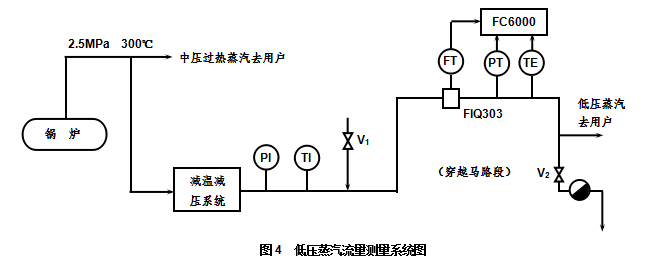 江蘇奧科儀表有限公司在為江蘇的一家藥業(yè)公司組建全廠蒸汽計(jì)量網(wǎng)的項(xiàng)目中,碰到了一個(gè)令人費(fèi)解的故障,這個(gè)故障發(fā)生在一個(gè)蒸汽流量計(jì)測量過熱蒸汽流量的系統(tǒng)中,這個(gè)系統(tǒng)的管道連接如圖4所示。